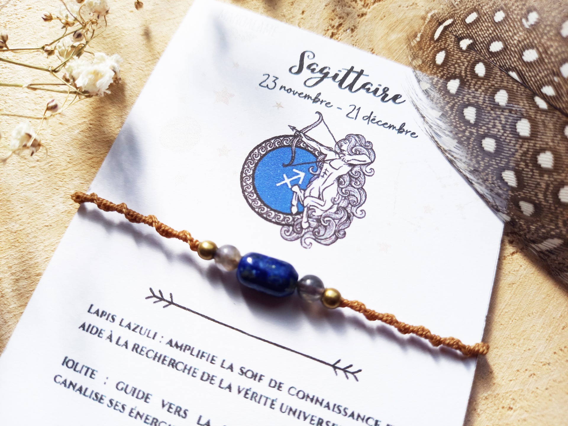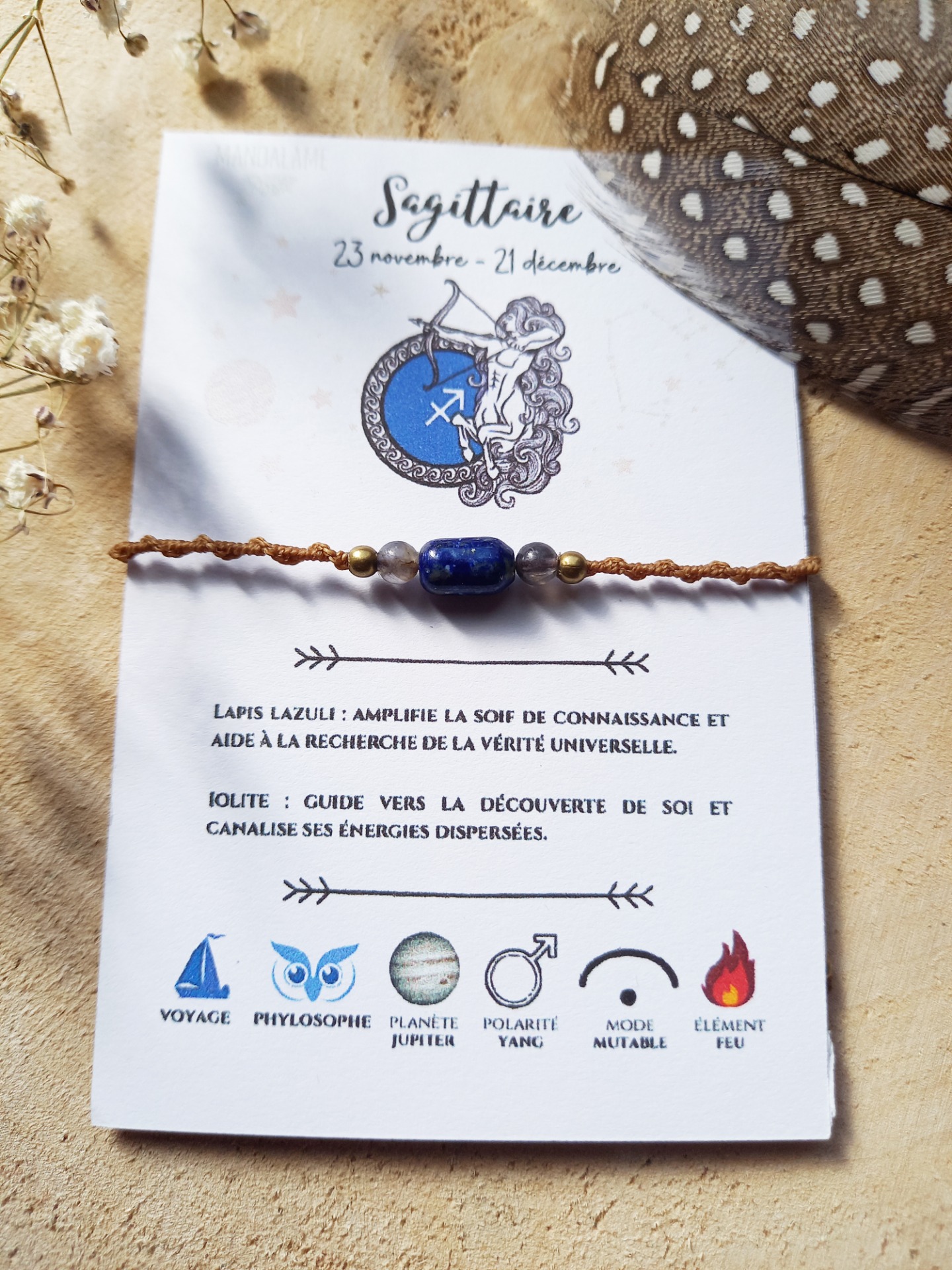 La fiche astrologique et vertus des pierres accompagne le bracelet.