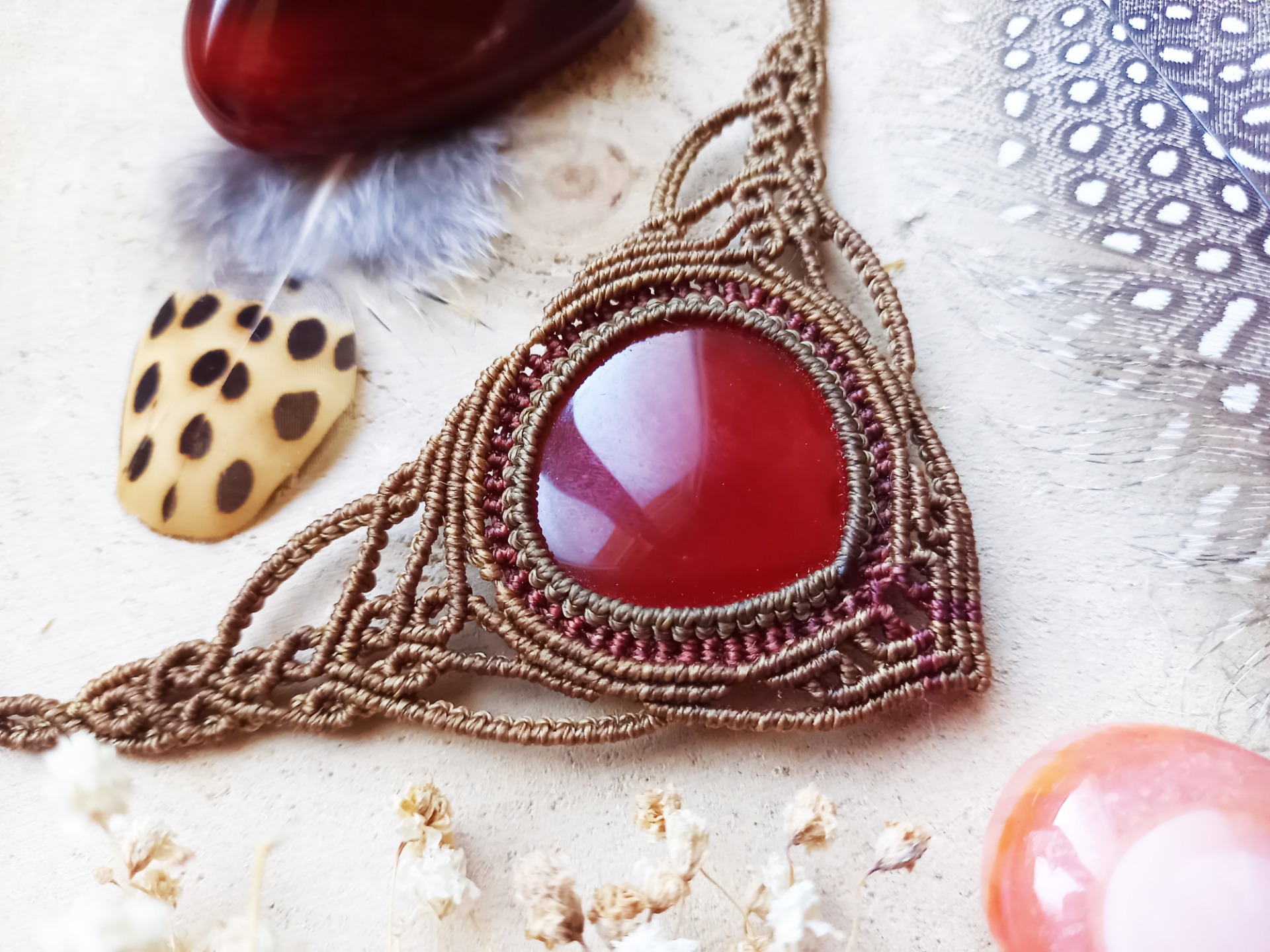 Collier Bohème en micro-macramé orné d'une magnifique Cornaline , entièrement tressé à la main.