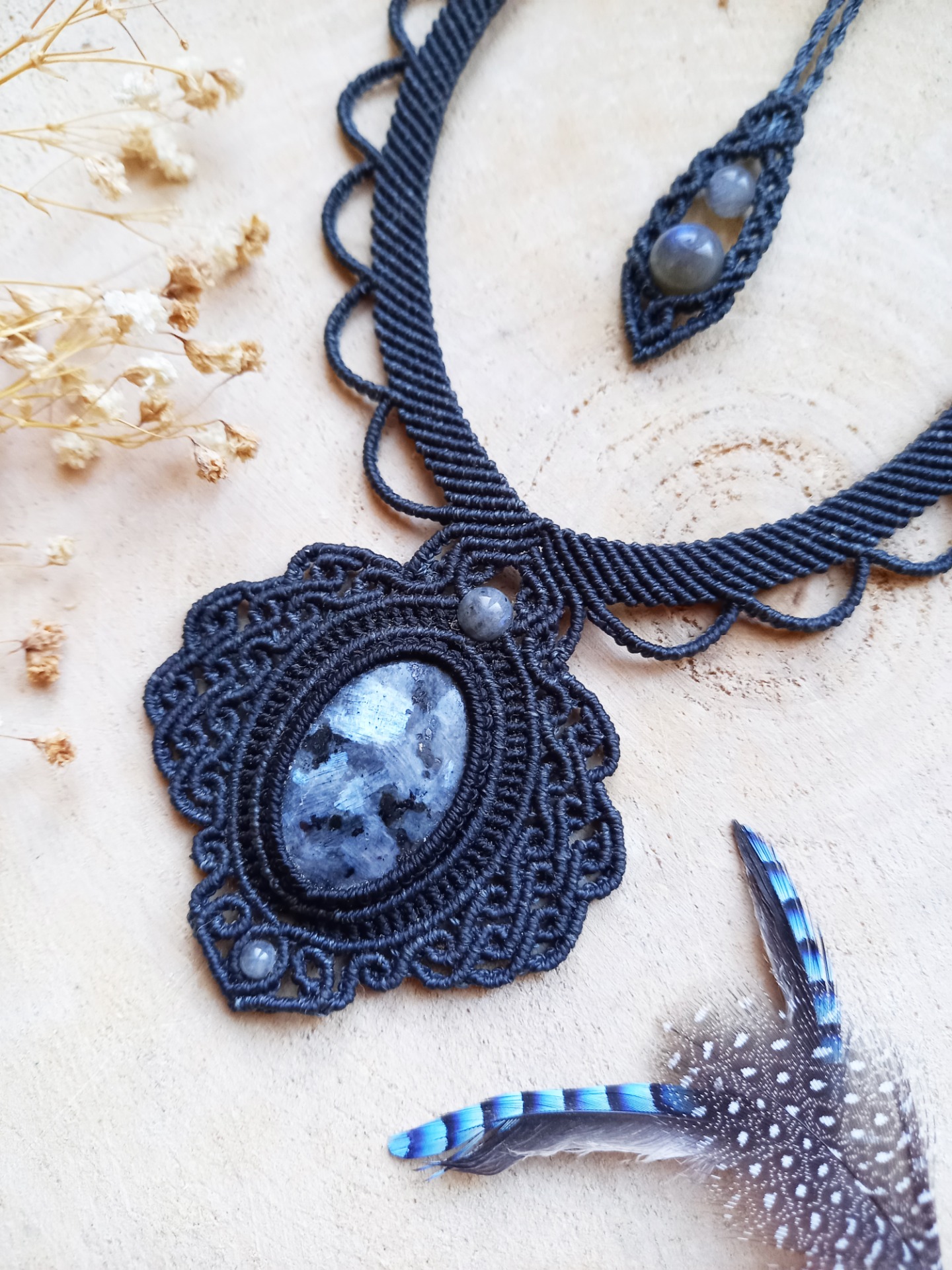 Collier Bohème en micro-macramé orné de lumineuse Larvikite, entièrement tressé à la main.