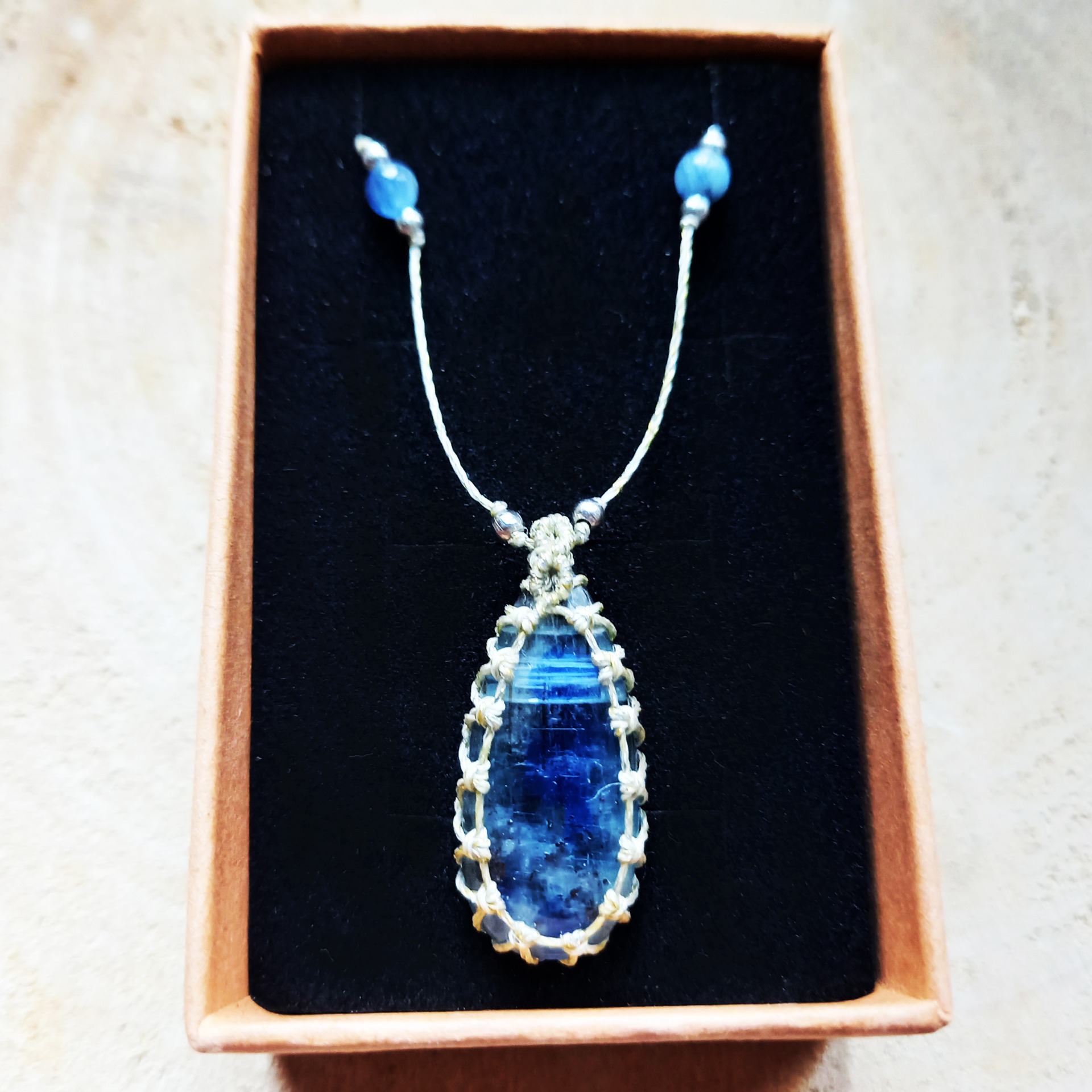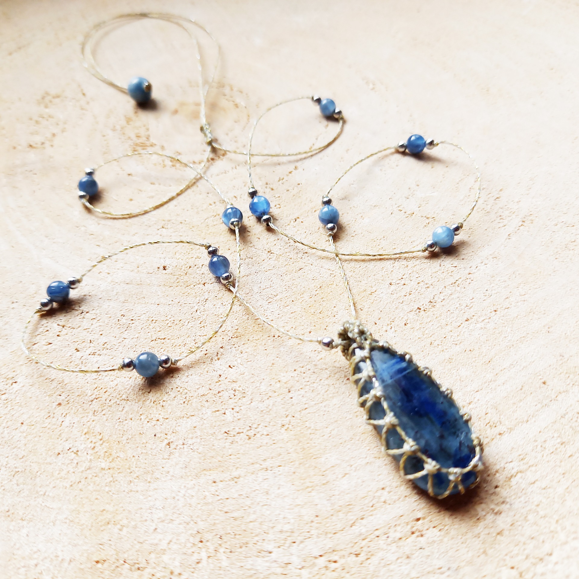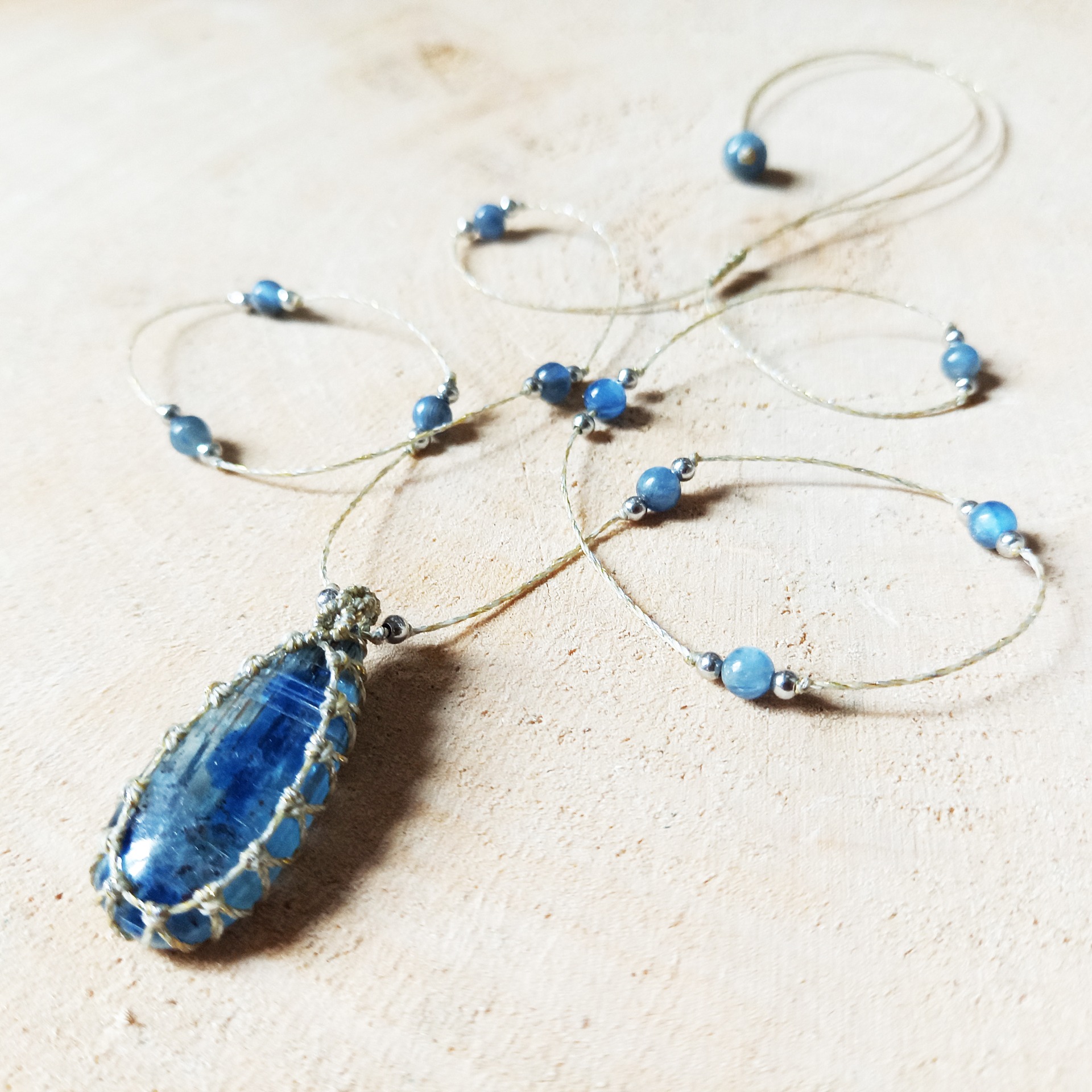 Collier orné d'une Cyanite provenant de Birmanie, tissé à la main avec des fils en polyester cirés, argentés, très résistants.