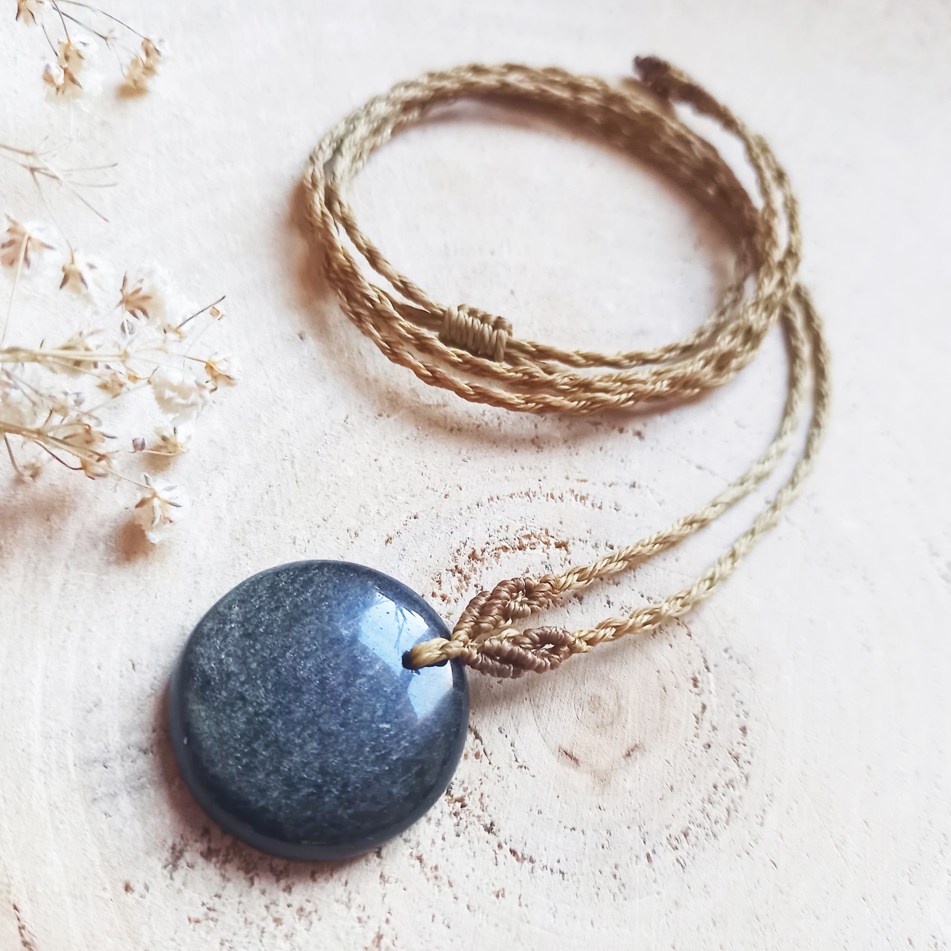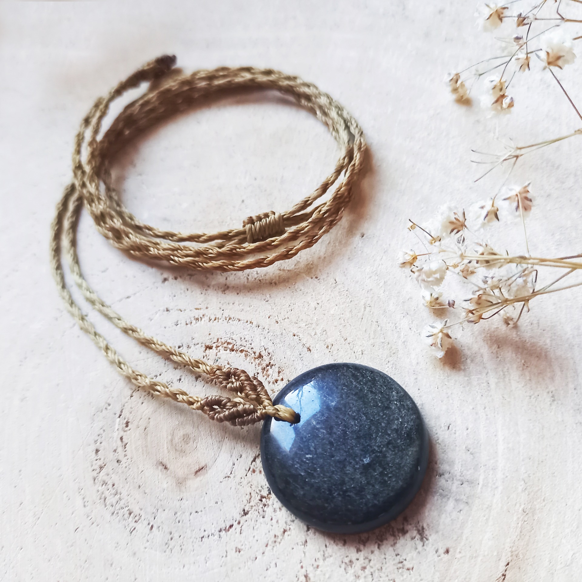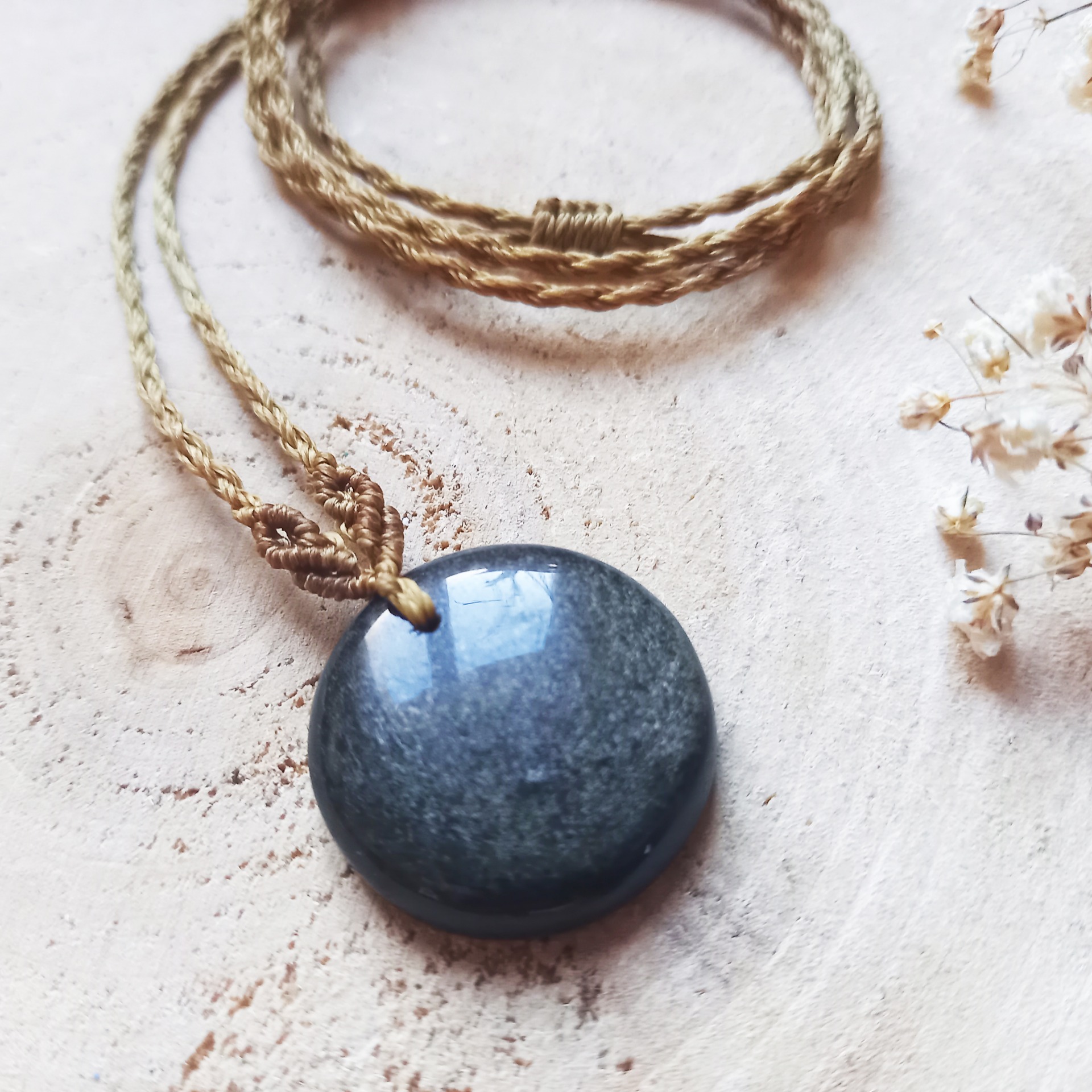 Collier en Obsidienne argentée, tissé de fils en polyester cirés, très résistants.