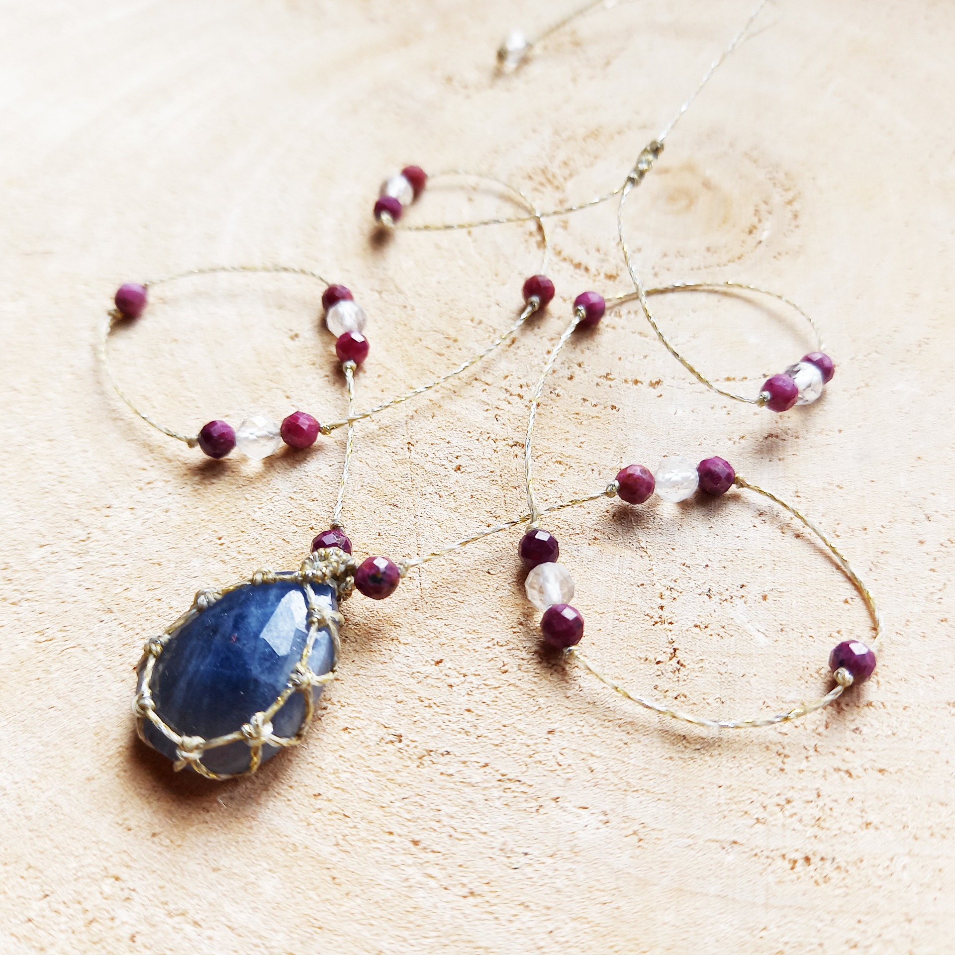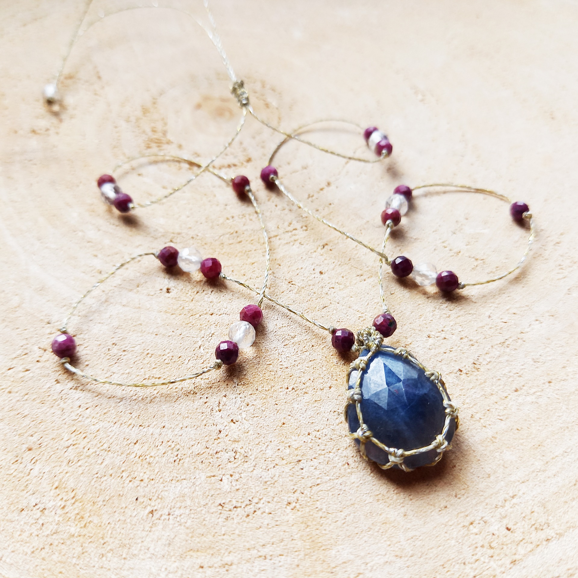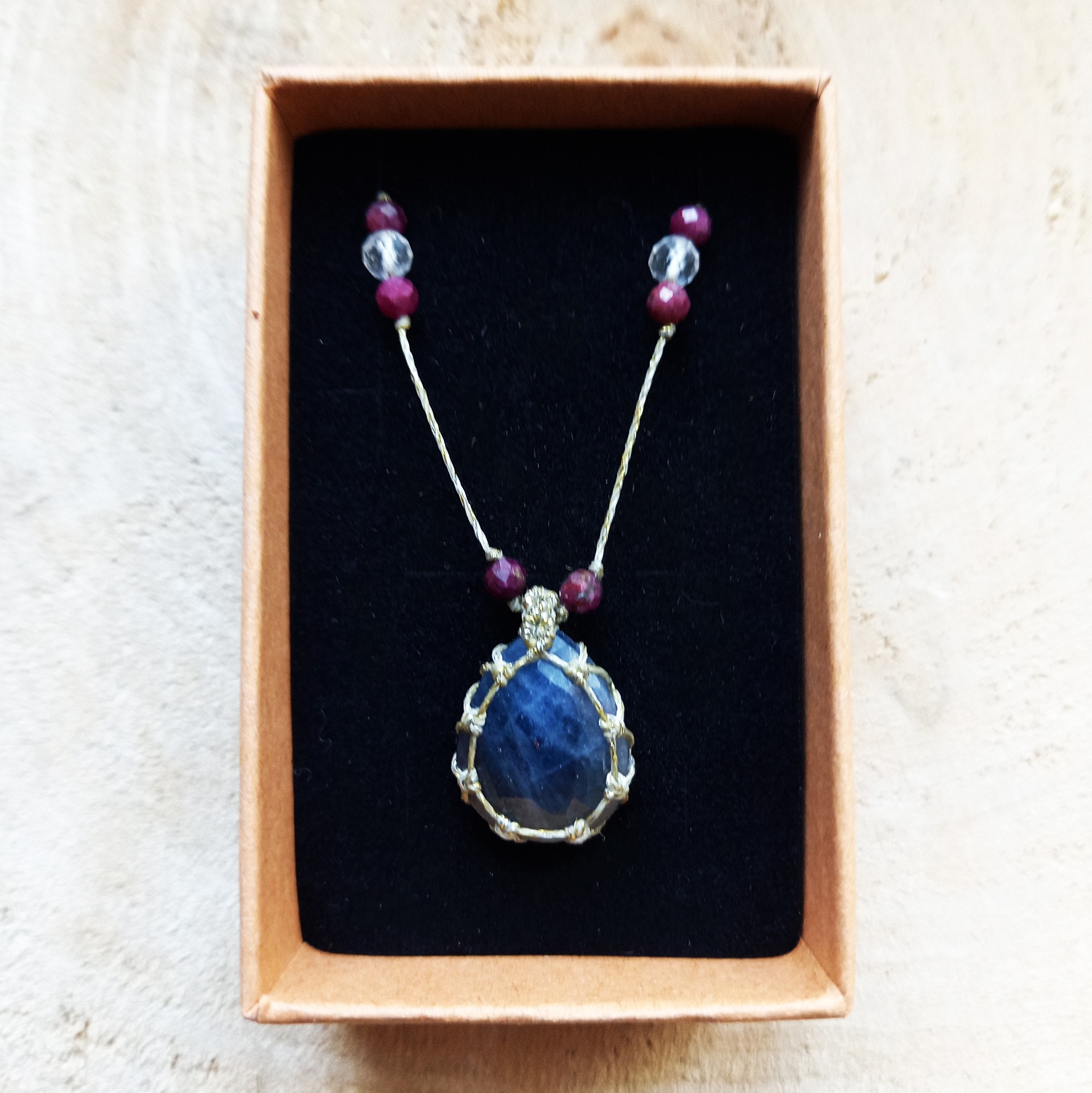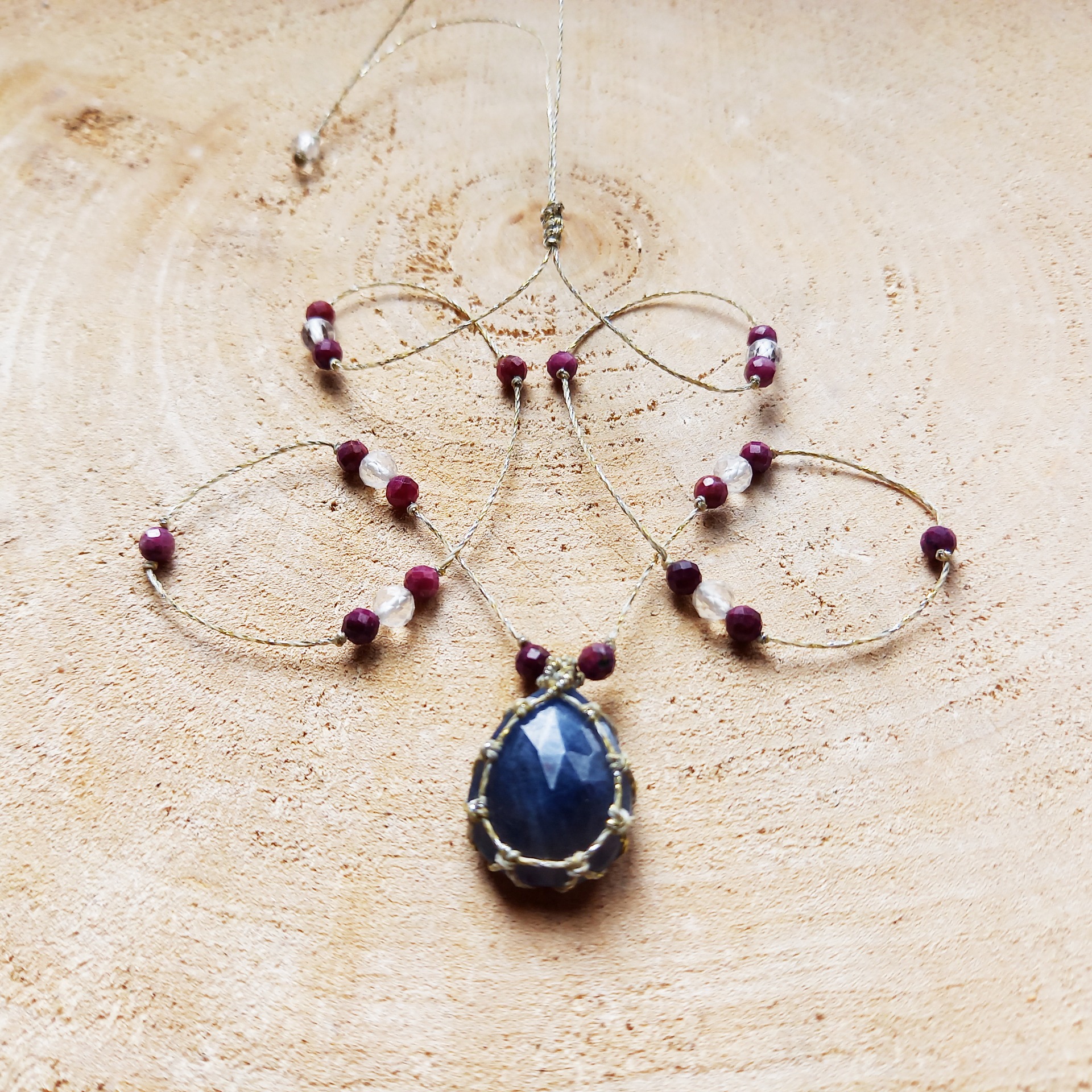 Collier orné d'un Saphir bleu facetté. Tissage à la main avec des fils en polyester cirés, argentés, très résistants.