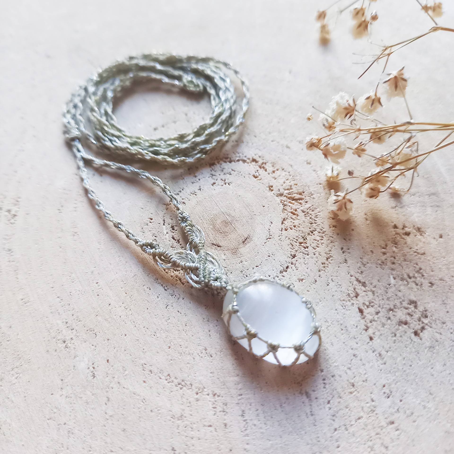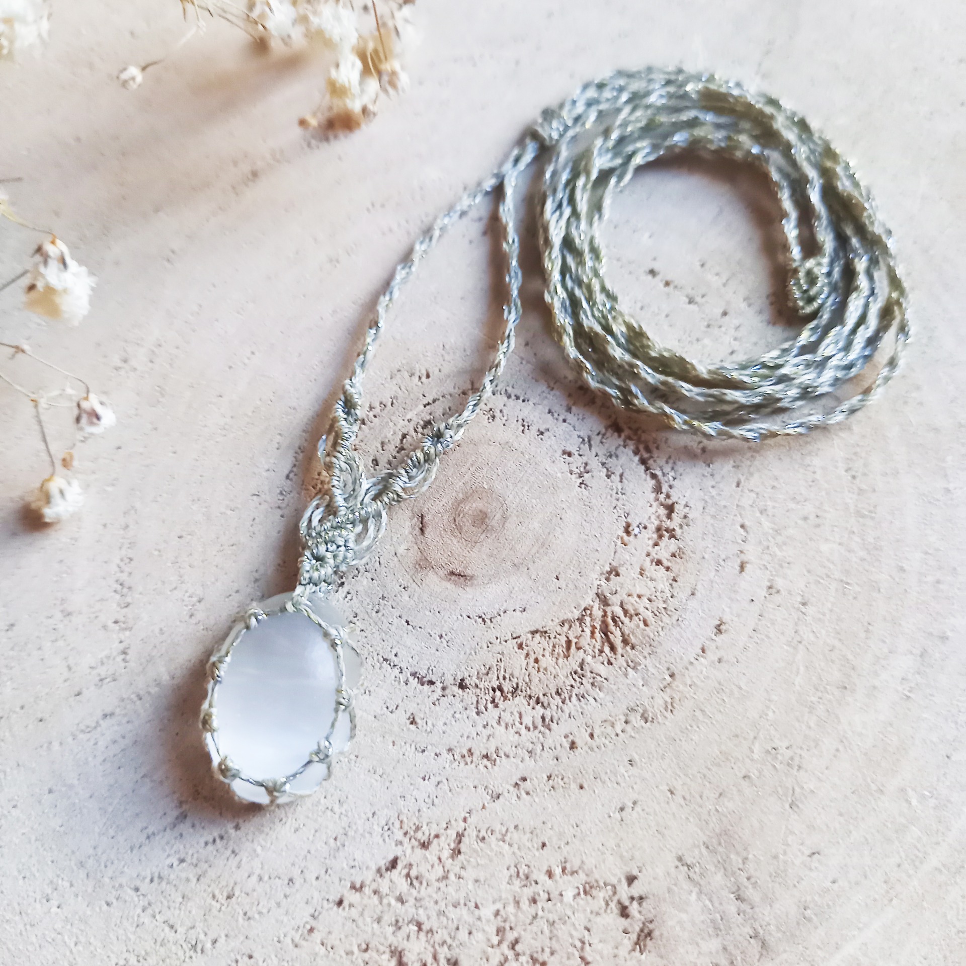 Collier en Sélénite, tissé de fils en polyester argentés et cirés ciré, très résistants.