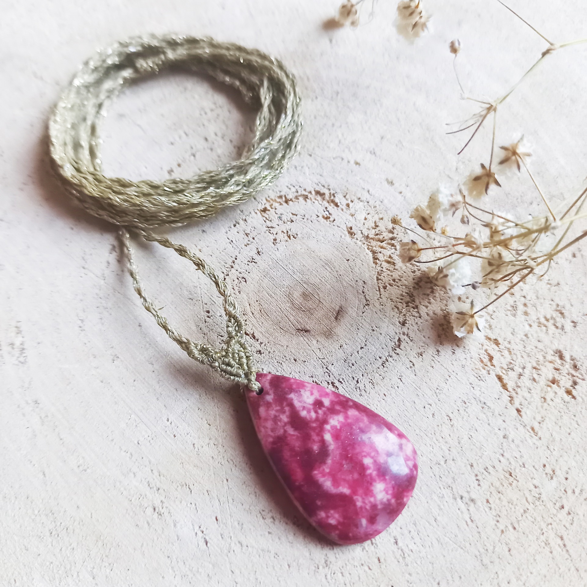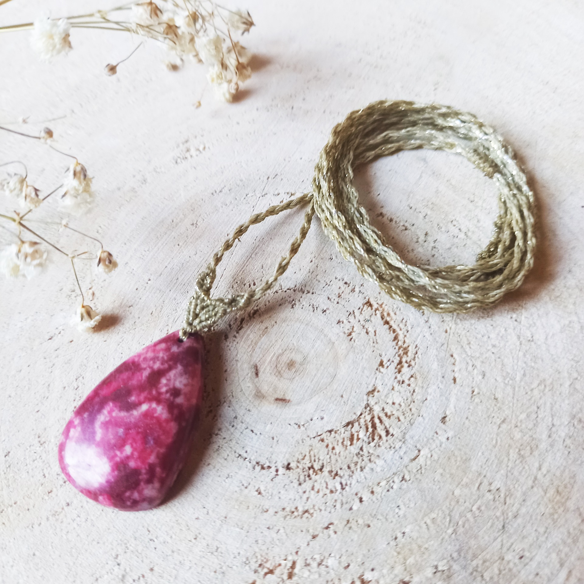 Collier en Thulite, tissé de fils en polyester dorés et cirés, très résistants.