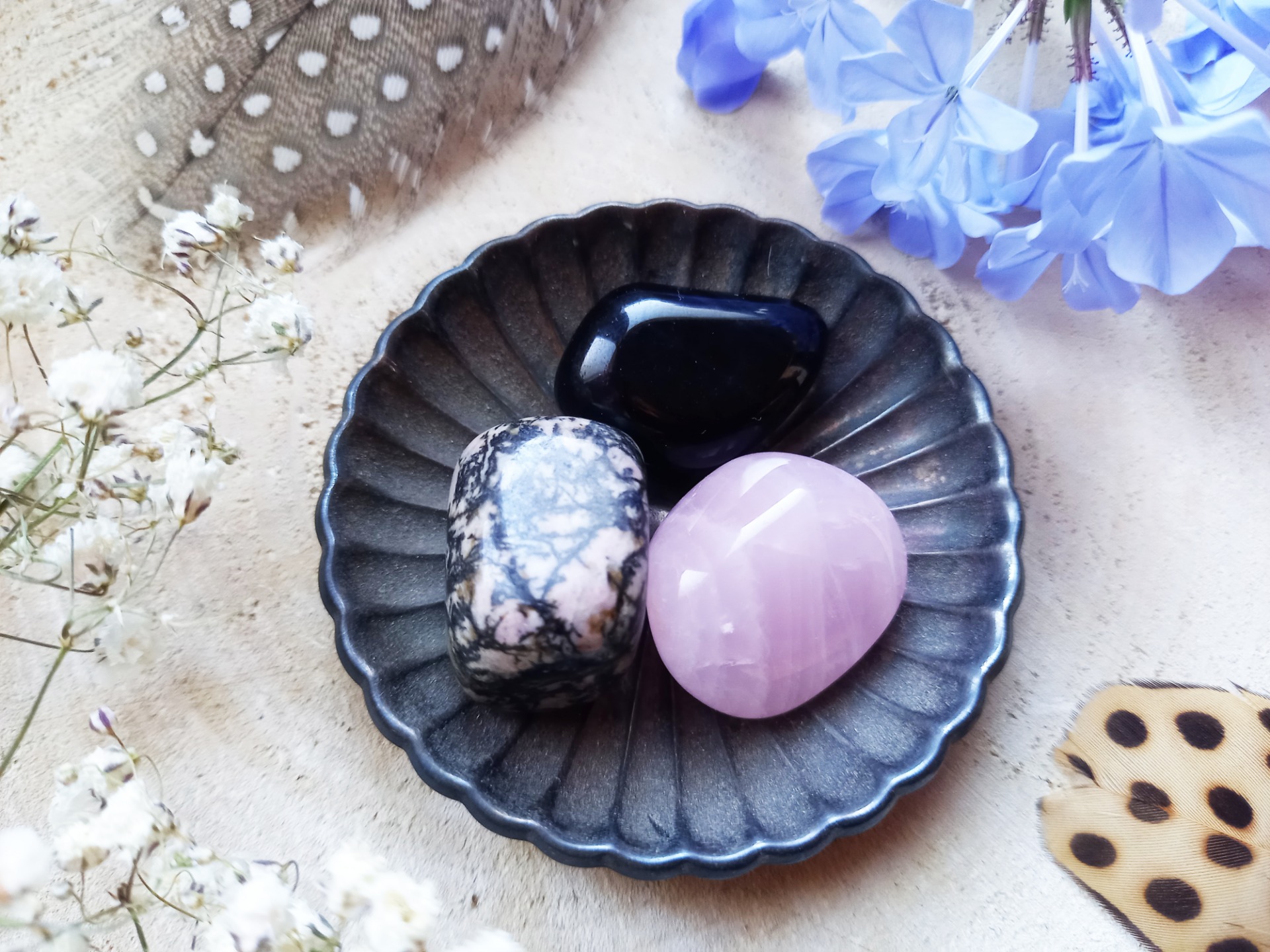 Il est intéressant de porter chacune des pierres sur soi par alternance. Commencez par exemple par le port de l'obsidienne, lorsque celle-ci devient trop lourde à porter passez au quartz rose, puis à la rhodonite. Et recommencez à chaque fois que vous en ressentez le besoin :)