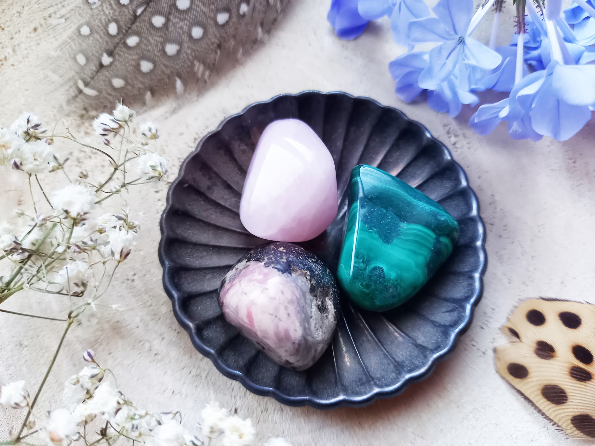 Il est intéressant de porter chacune des pierres sur soi par alternance, de quelques jours à quelques semaines. Commencez par exemple par le port du quartz rose, qui vous apportera du réconfort et un sentiment de sécurité affective, puis passez à la rhodonite pour travailler sur ce qui vous pèse et vous en libérer, et enfin portez la malachite pour transformer vos schémas de pensés afin repartir sur de nouvelles bases. Pour les états émotionnels très ancré il est conseillé de pratiquer ce cycle complet plusieurs fois pour pouvoir pour en venir à bout.