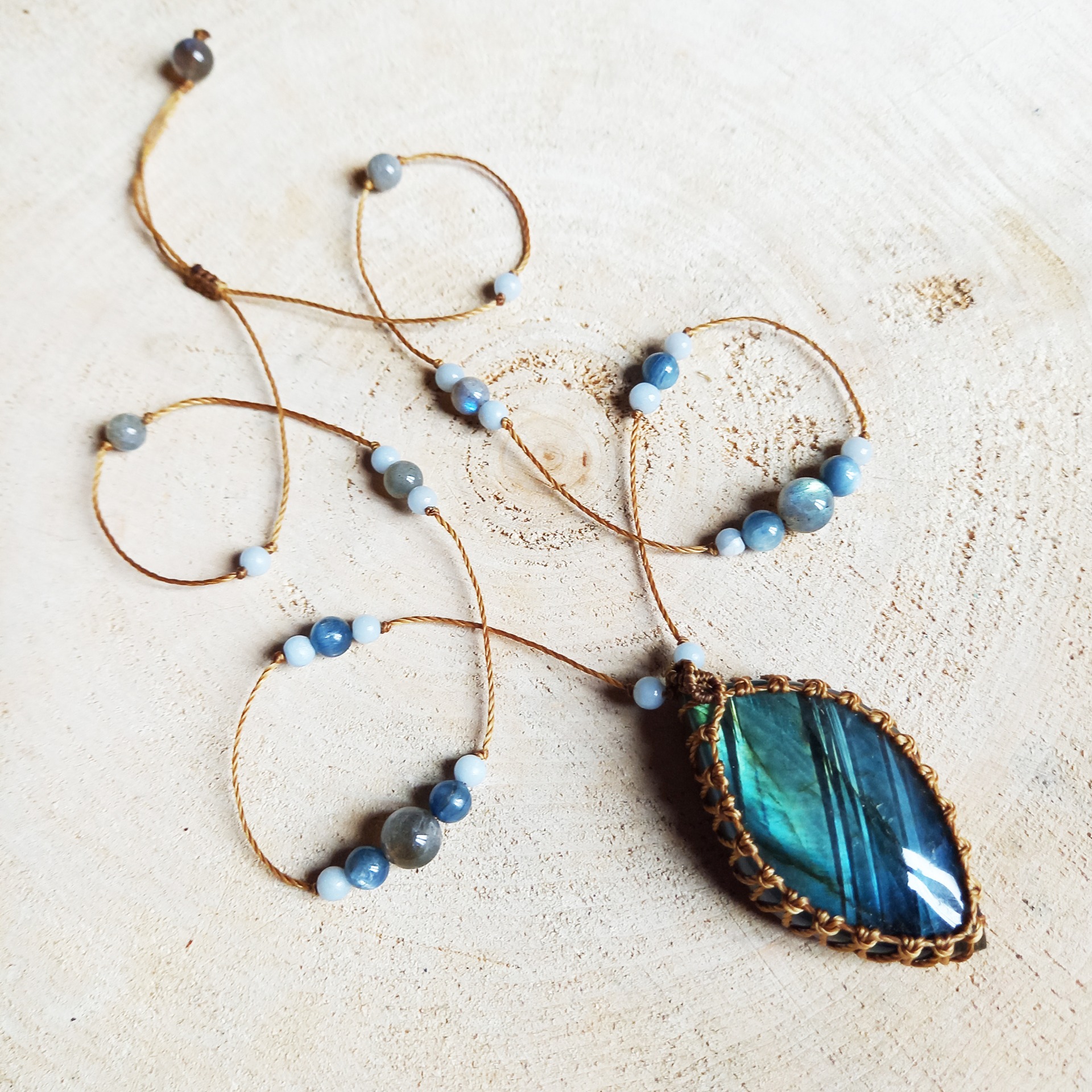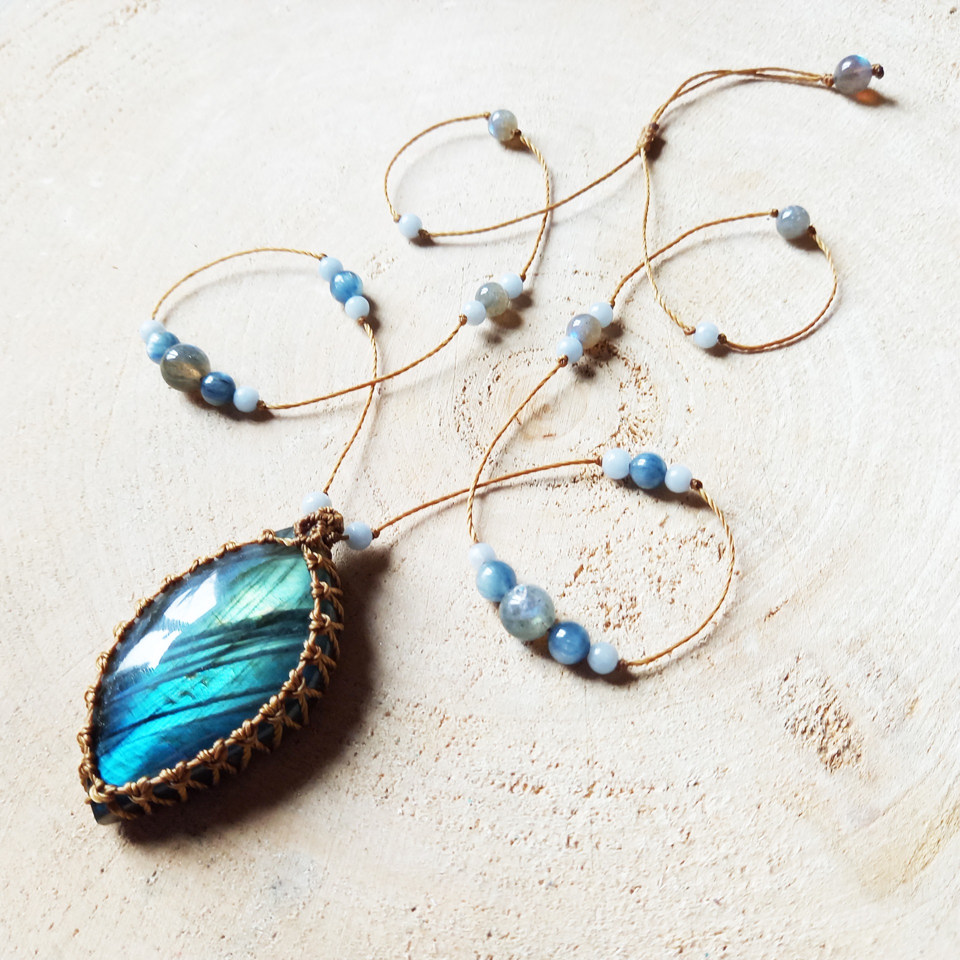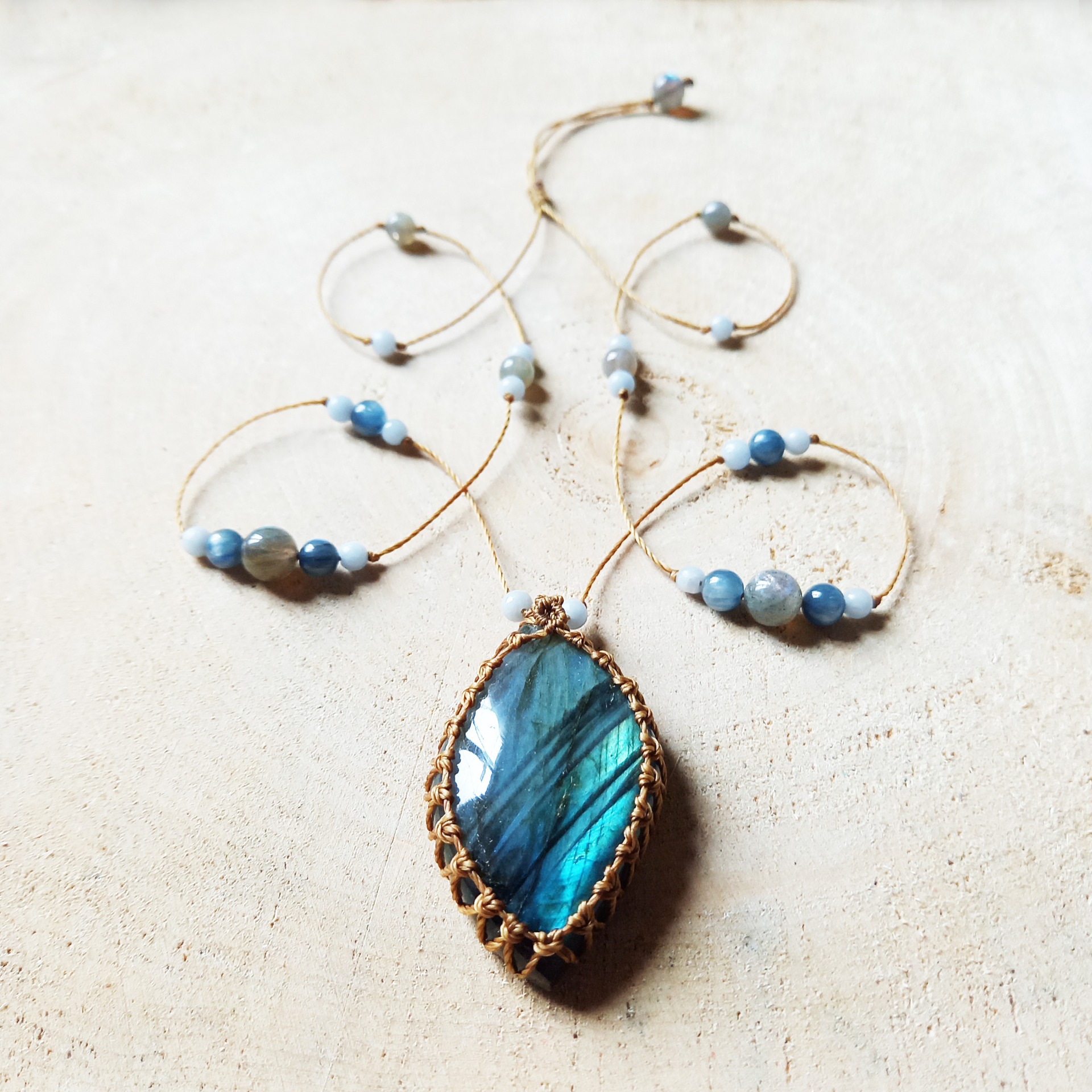 - Perles (4 à 8 mm) : Labradorite, Calcédoine bleue, Cyanite