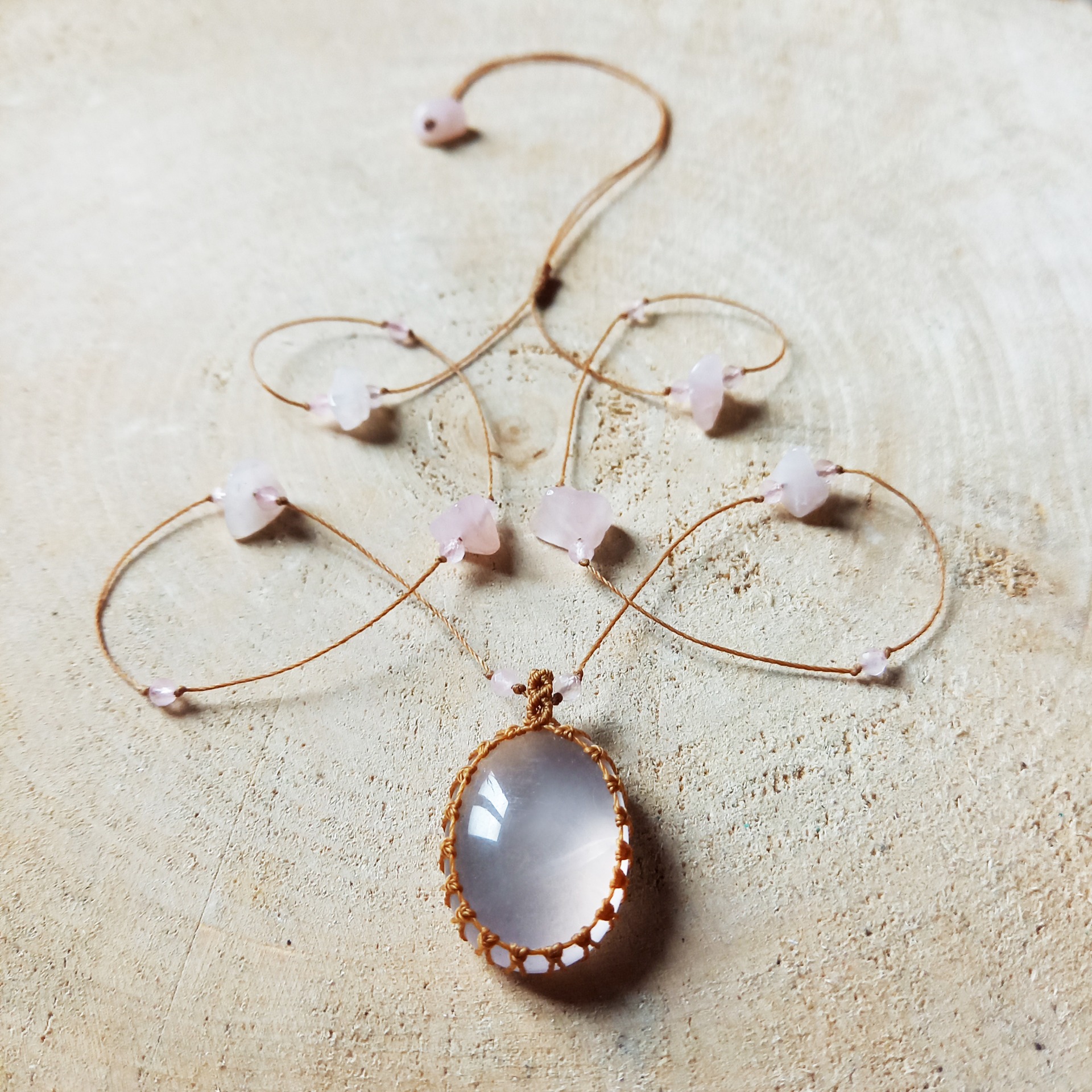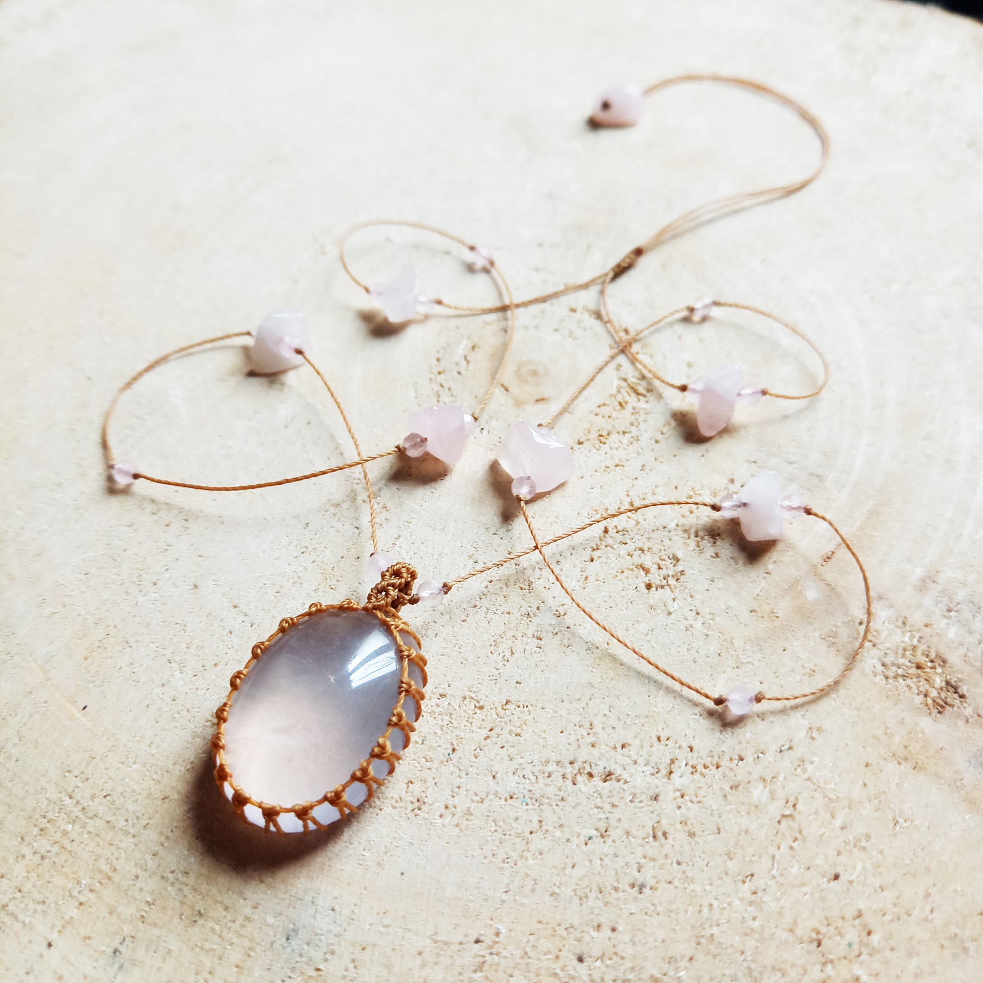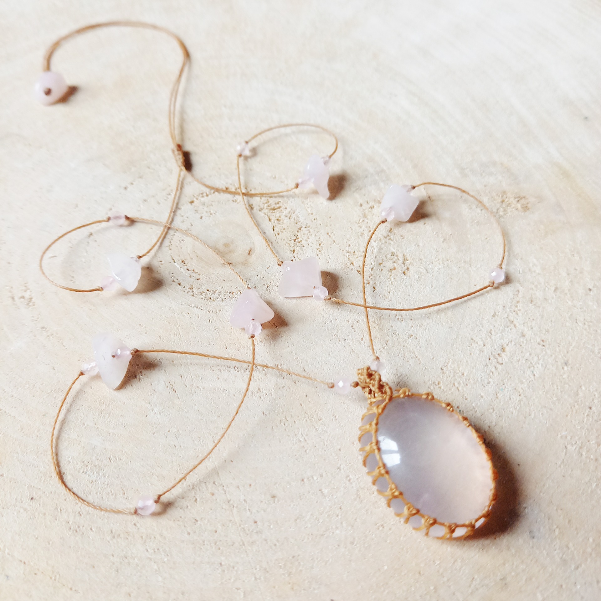 Sautoir en Quartz rose, délicat et poétique, agréable à porter.